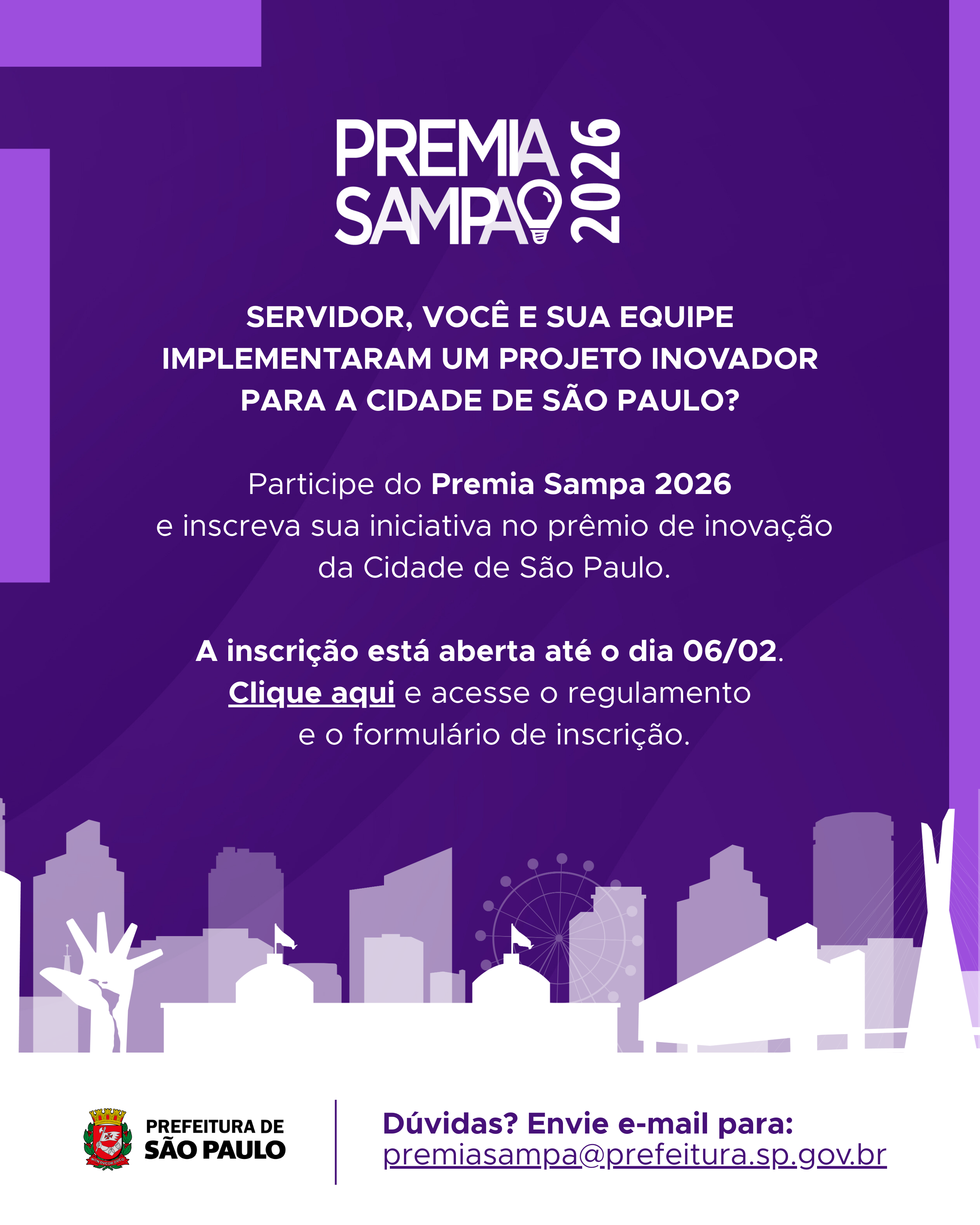 As inscrições estão abertas até o dia 06/02, se você e sua equipe implementaram um projeto inovador para a cidade de São Paulo, inscreva-se no Premia Sampa.